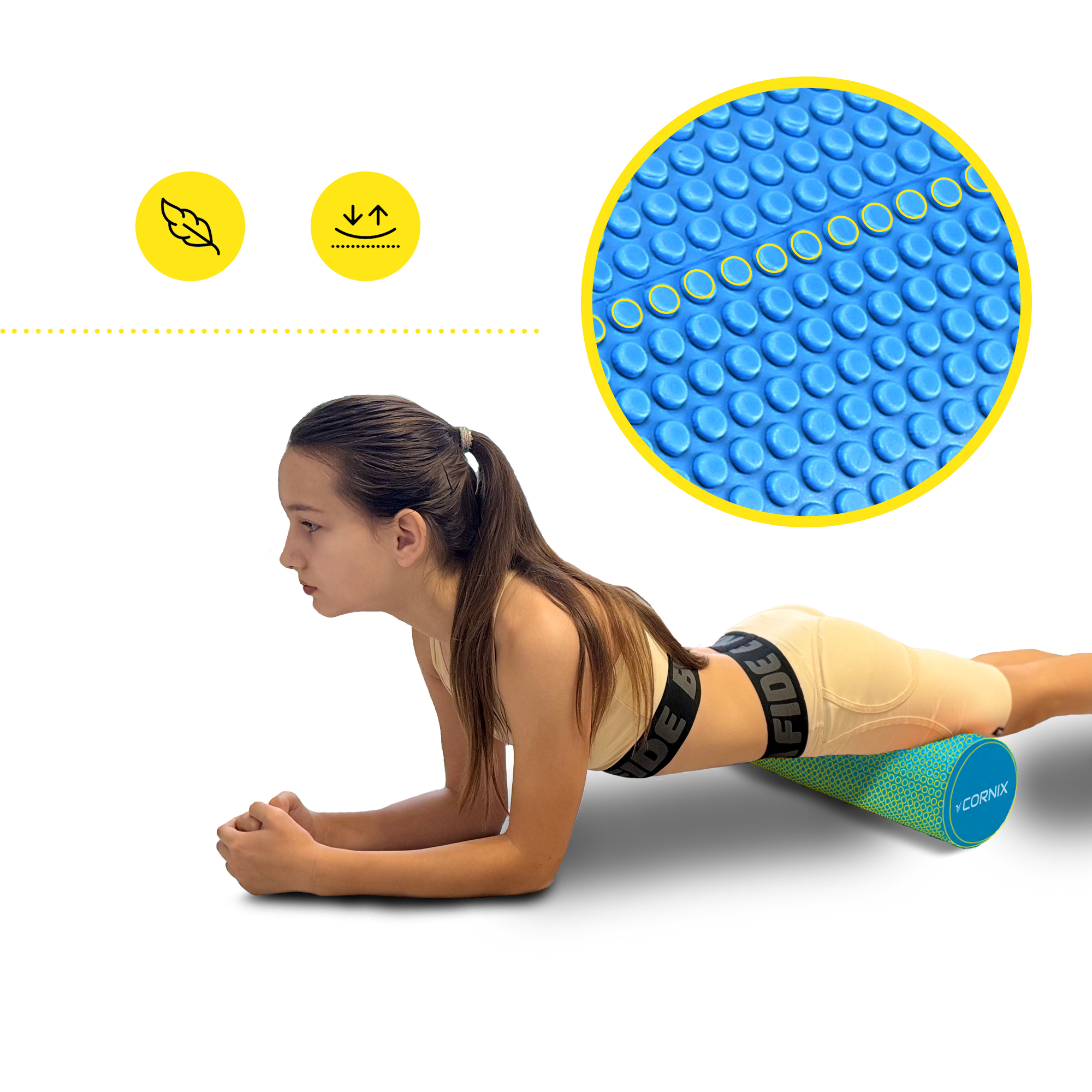 Спортивний ролик Cornix EVA+ виготовлений із високоякісного матеріалу EVA, який відзначається міцністю, стійкістю до деформацій і довговічністю. Завдяки середньому рівню твердості він підходить для широкого кола користувачів - від новачків до досвідчених спортсменів. Довжина ролика складає 45 см, а діаметр - 15 см, що дозволяє ефективно опрацьовувати великі м'язові групи, такі як спина, стегна чи сідниці, забезпечуючи глибший і рівномірніший масаж. Незважаючи на довжину, ролик зберігає легку вагу, що спрощує транспортування та використання у різних умовах - вдома, у спортзалі або навіть у подорожах. Текстурована поверхня гарантує надійний контакт із тілом, не ковзає та створює приємний масажний ефект.