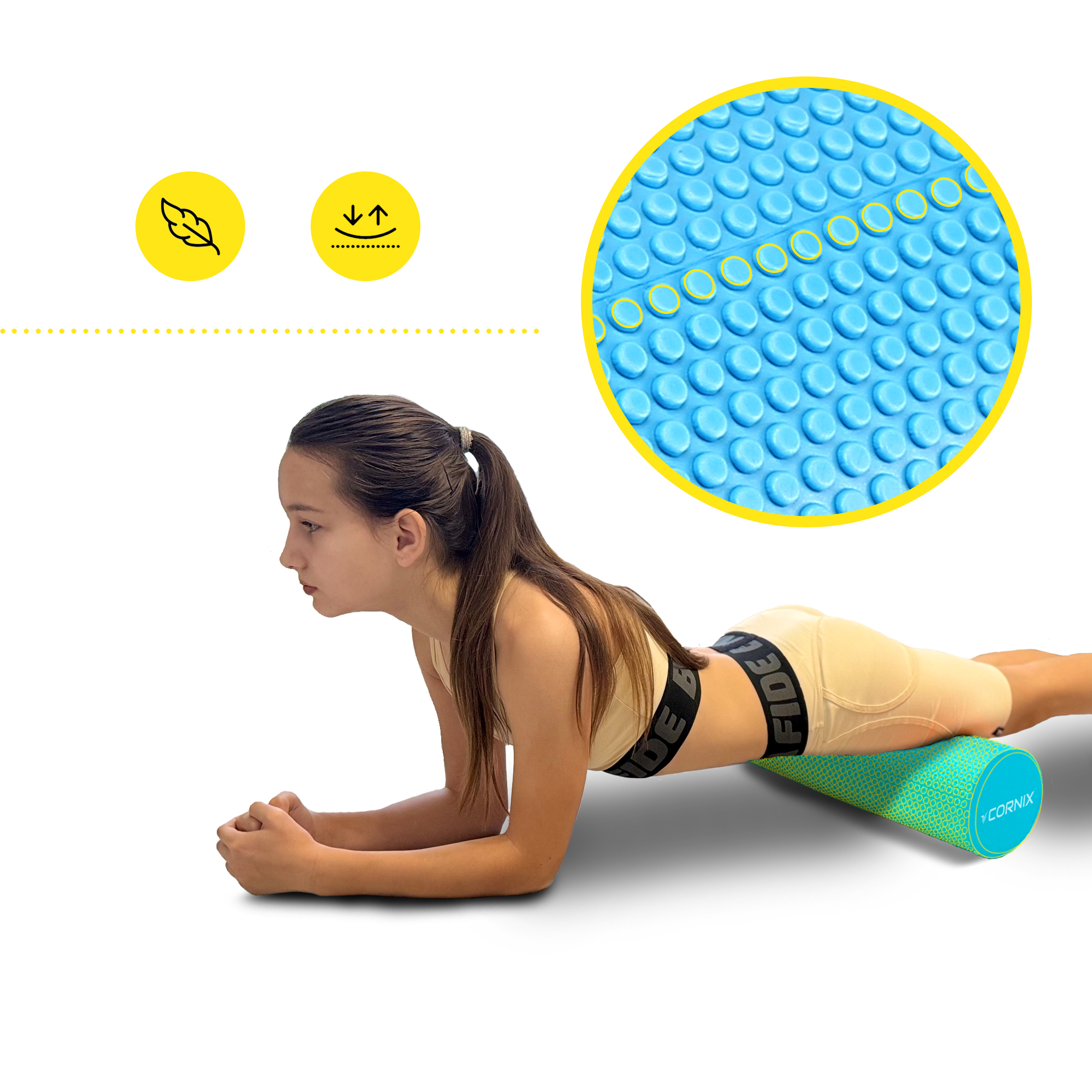 Спортивний ролик Cornix EVA+ виготовлений із високоякісного матеріалу EVA, який відзначається міцністю, стійкістю до деформацій і довговічністю. Завдяки середньому рівню твердості він підходить для широкого кола користувачів - від новачків до досвідчених спортсменів. Довжина ролика складає 45 см, а діаметр - 15 см, що дозволяє ефективно опрацьовувати великі м'язові групи, такі як спина, стегна чи сідниці, забезпечуючи глибший і рівномірніший масаж. Незважаючи на довжину, ролик зберігає легку вагу, що спрощує транспортування та використання у різних умовах - вдома, у спортзалі або навіть у подорожах. Текстурована поверхня гарантує надійний контакт із тілом, не ковзає та створює приємний масажний ефект.