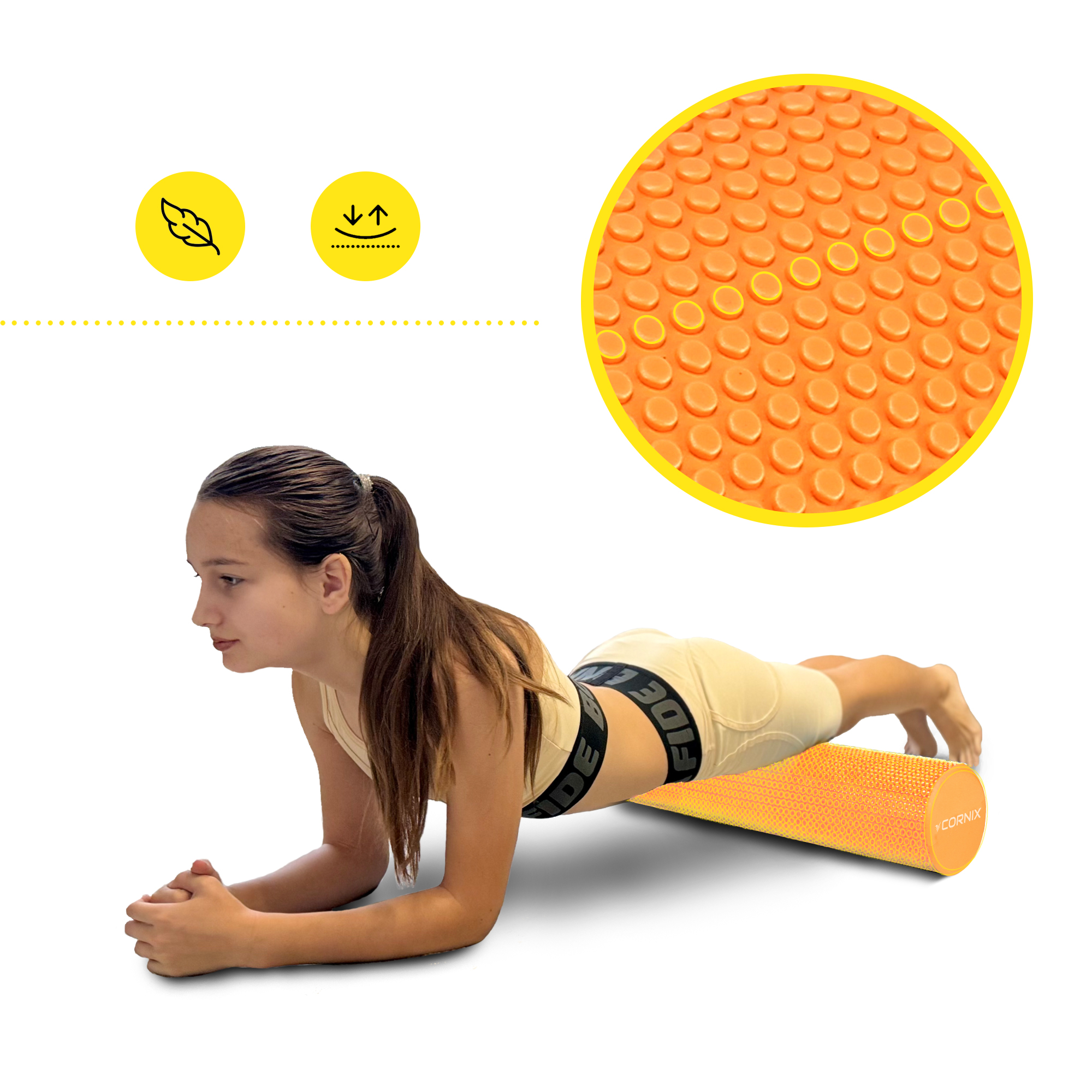 Спортивний ролик Cornix EVA+ виготовлений із високоякісного матеріалу EVA, який відзначається міцністю, стійкістю до деформацій і довговічністю. Завдяки середньому рівню твердості він підходить для широкого кола користувачів - від новачків до досвідчених спортсменів. Довжина ролика складає 60 см, а діаметр - 15 см, що дозволяє ефективно опрацьовувати великі м'язові групи, такі як спина, стегна чи сідниці, забезпечуючи глибший і рівномірніший масаж. Збільшений розмір також робить його зручним для людей із більшою комплекцією, адже він краще охоплює тіло та дозволяє виконувати вправи з підвищеним комфортом. Незважаючи на довжину, ролик зберігає легку вагу, що спрощує транспортування та використання у різних умовах - вдома, у спортзалі або навіть у подорожах. Текстурована поверхня гарантує надійний контакт із тілом, не ковзає та створює приємний масажний ефект.
